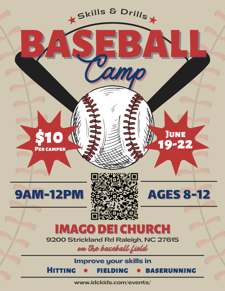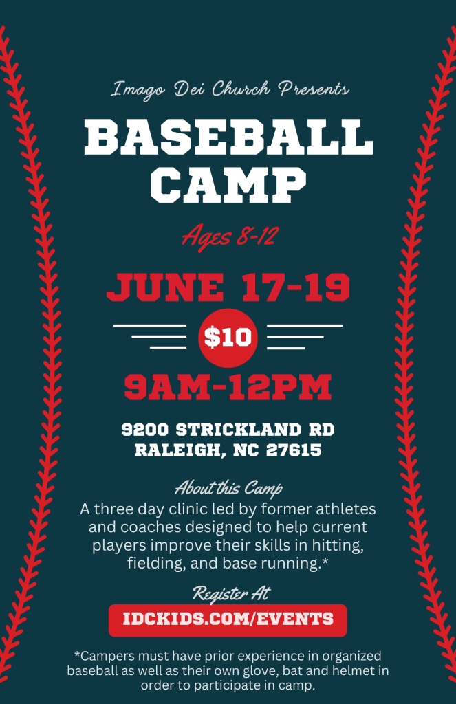 Three days of camp focused on improving your current athlete’s hitting, fielding, and base running skills. The camp will be led by former coaches and players and will operate on the baseball field at Imago Dei Church (9200 Strickland Rd Raleigh, NC 27615) from 9:00am-12:00pm Tuesday, June 17 through Thursday, June 19. The cost is $10 per camper and includes a t-shirt. Campers must be between 8 and 12 years by the last day of camp. Space is limited!