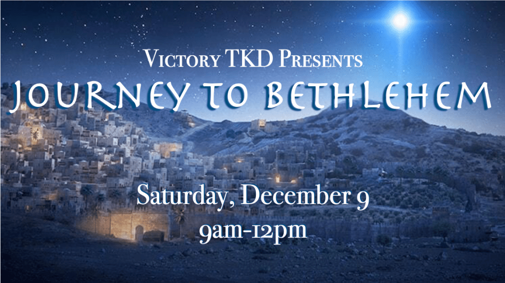 Join Victory Taekwondo on Saturday, December 10 from 9:00am-12:00pm for an interactive Christmas event giving children the opportunity to experience the real meaning of Christmas through joining the Journey to Bethlehem. After dressing in Biblical cloaks, participants will join caravans headed to Bethlehem. Here they interact with Mary and Joseph on the road from Nazareth, Shepherds in a field under a starry sky, Wise Men planning their trip, and Simeon and Anna expectantly waiting at the Temple in Jerusalem. All these characters then come together to present an exciting drama full of truth and awe.