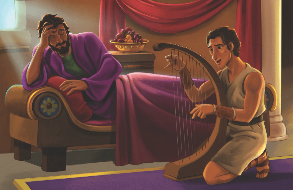 When God rejected Saul as king, the Spirit of the Lord left him, and an evil spirit tormented him day and night. After one of Saul’s young men heard David play the lyre, Saul sent his servants to retrieve the young David, believing he could relieve his distress. Previously, we learned that David was a man after God’s own heart, and here we see a humble, servant-like heart as David played the lyre in Saul’s time of distress.